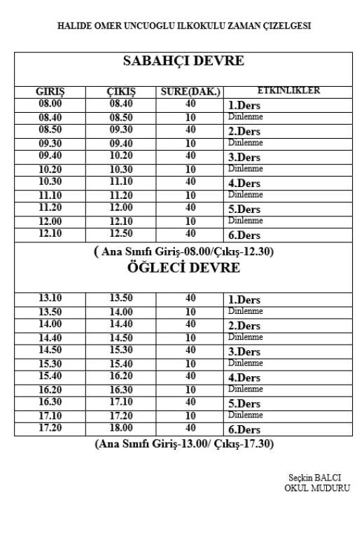 07.04.2025 tarihinden itibaren 40 dakikalık ders saati sistemine dönülmüş olup çizlgemiz aşağıdaki gibidir.